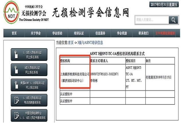 中国无损检测学会官网发布 麒济国际培训中心为ASNT3级授权培训机构