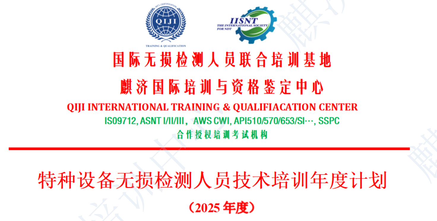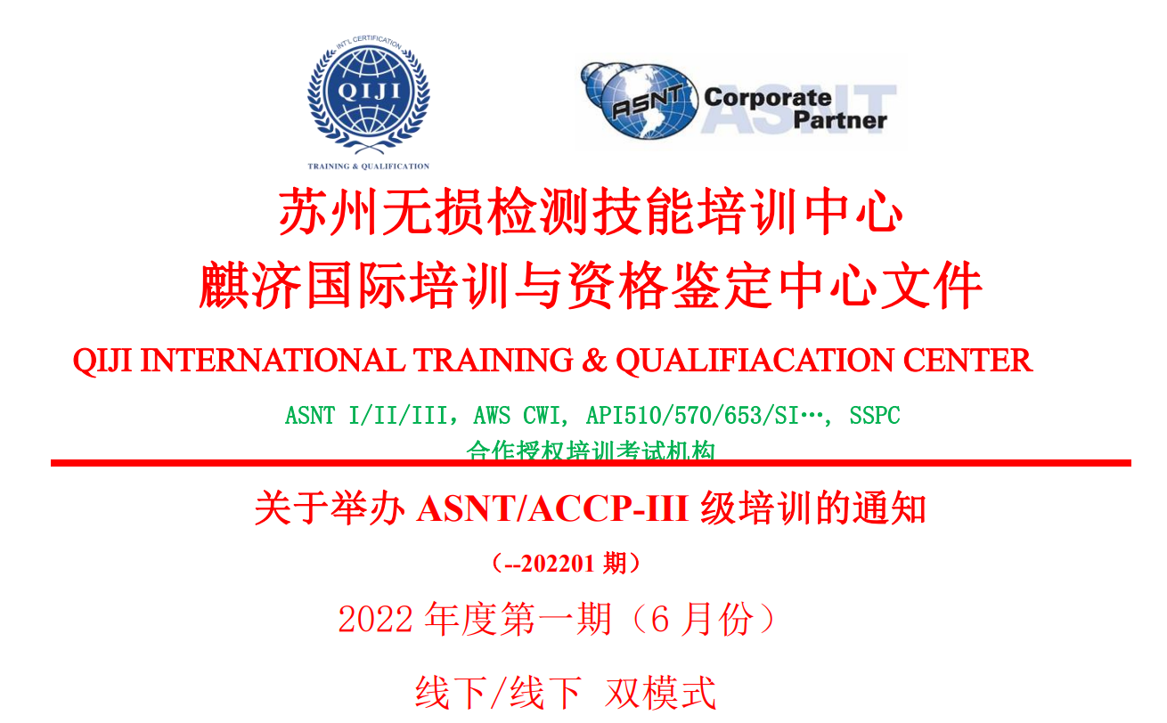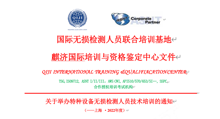 长期以来,麒济国际培训与资格鉴定中心是专业从事重工质检领域国际资质/资格认证的国际性机 构,是美国无损检测学会企业合作伙伴(ASNT CORPORATE PARTNER, ID NO. 290680),同 时也致力于无损检测、焊接检验等领域的培训和资格鉴定服务,在全球重工领域具有较高 知名度和认可度。 为了更好地满足无损检测人员技能提升和职业规划的需求,麒济国际培训中心已推出 一系列精选网络课程,能够丰富且促进无损检测人员持续学习和积极充电,提高自身专业 技能和行业竞争力。同时,麒济国际培训中心的专业教学团队保证教学质量与学习效果, 确保高质量高效率地取得国际标准规定的培训学时和人员资格证书。现将相关事项通知如下: