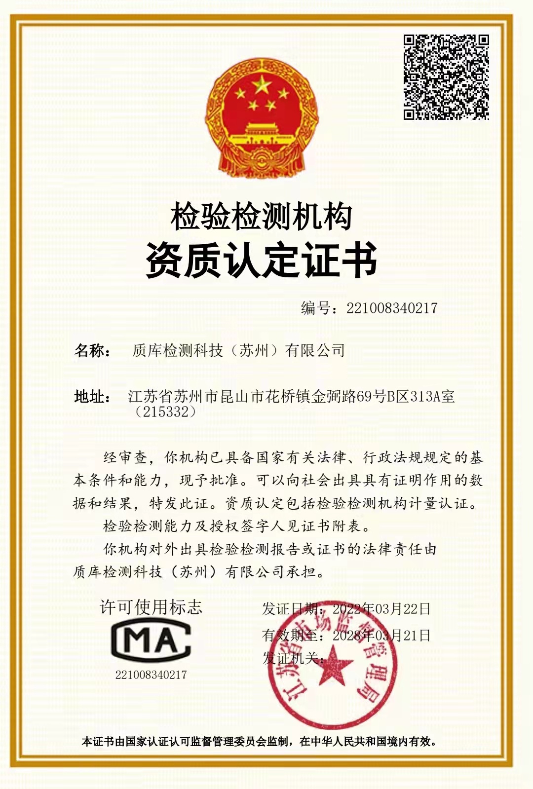 麒济控股第三方无损检测公司获得CMA资质 热烈祝贺质库检测科技(苏州)有限公司通过CMA认证!
